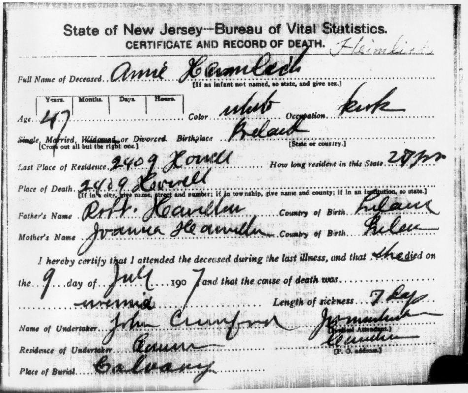 Annie married Carl Augustus Heimlich, son of Christoph Heimlich and Johanna Klause, about 1885. (Carl Augustus Heimlich was born on Jun 10, 1858 in Germany, died on May 28, 1945 in Camden and was buried on Jun 2, 1945 in Calvary Cemetary, Cherry Hill, NJ..) |